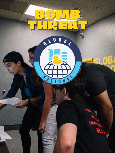 Due to a delightful loophole in airline miles, you're about to engage in our totally legal, first-ever live-bomb-training exercise. While you're safely secluded in an evacuated wing of the building, rest assured, we'll be monitoring your every quack—I mean, move.